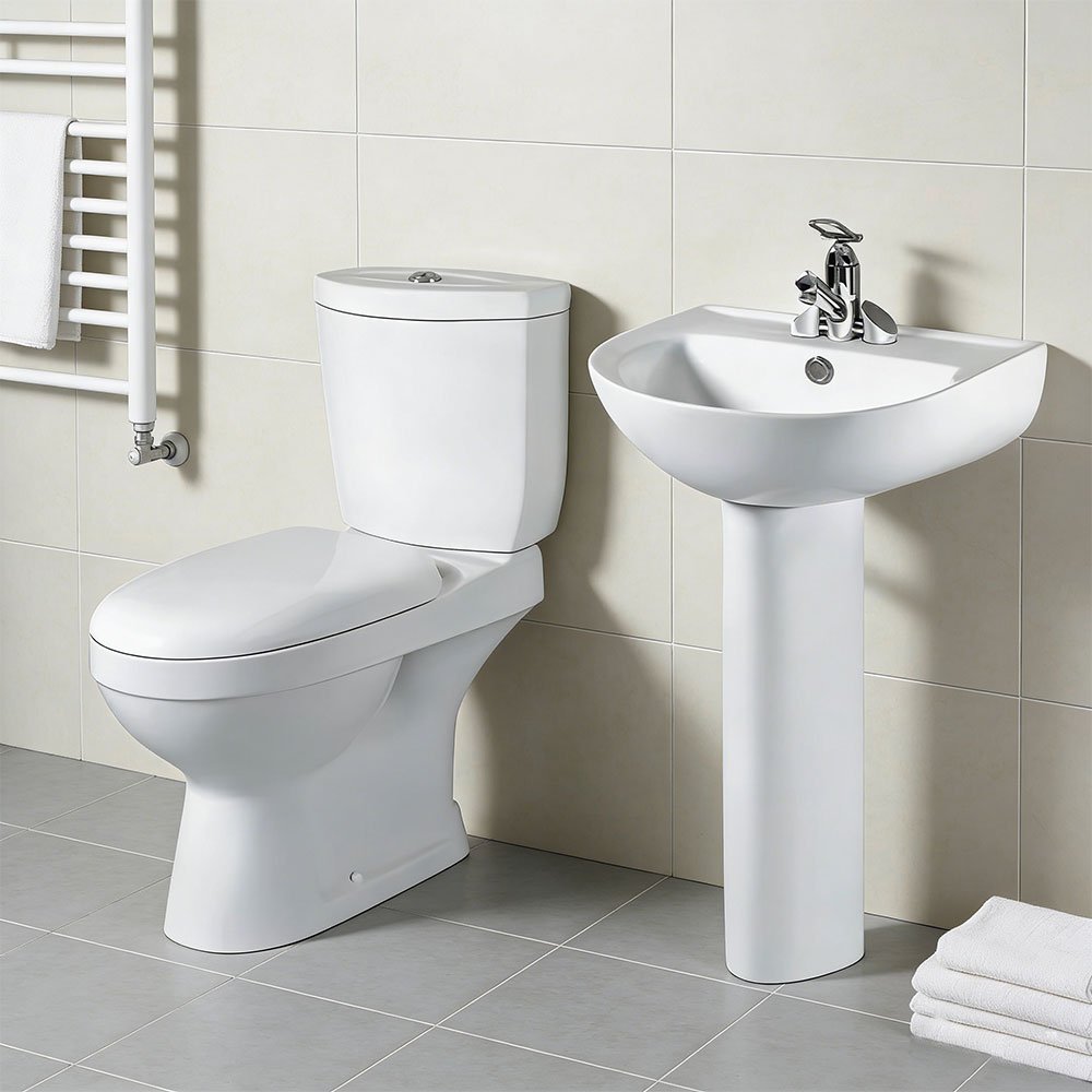 • Two-piece toilet and pedestal wash basin set designed for compact bathroom spaces.